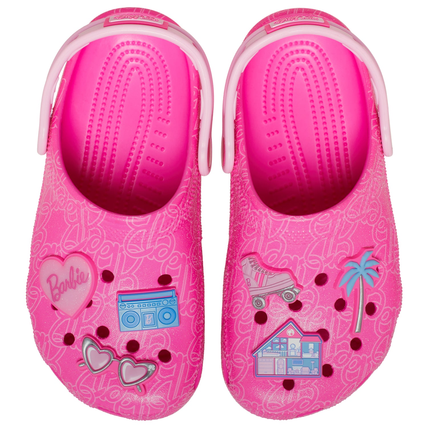 Step into style with the new Barbie Classic Clog. The ultimate statement shoe for fashion lovers everywhere. This effortlessly chic clog shines in a playful pink hue and features an all-over Barbie monogram print. Add a touch of glam with exclusive enamel Jibbitz charms inspired by iconic Barbie symbols, including a Dreamhouse, roller skate, palm tree, heart sunglasses, and the classic Barbie logo.
